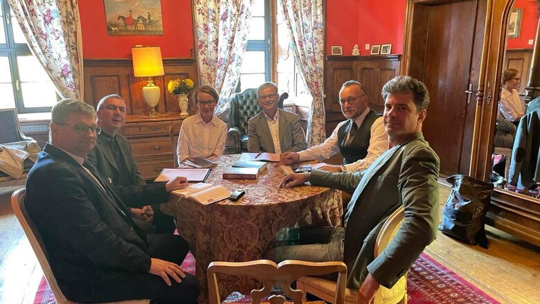 Zum Abend der Begegnung hatte die Gemeinschaft evangelischer Schlesier unter Generalsuperindent iR Martin Herche nach Laubusch eingeladen. Dabei entwickelte sich ein Austausch über das Thema Ankommen - Weiterziehen - Bleiben mit Waldemar Pytel (evangelischen Bischof von Breslau), Daniel Schmidt (Superintendenten des evangelischen Kirchenkreises Schlesische Oberlausitz), Friedhart Vogel (Superintendent iR), Frank Lehmann (Bürgermeister Lauta), Frank Hirche (Landesvorsitzender Sachsen der Vertriebenen) und auch dem Beauftragten des Freistaates. Dabei kam die reiche grenzüberschreitende Arbeit und vor allem die vielen Gemeinsamkeiten, die wir manchmal gar nicht mehr sehen, weil sie uns eigen geworden sind, zum Tragen. Wir sind über die Grenzen hinweg eine Gemeinschaft, weiter als die Politik manchmal glaubt. Die evangelischen Schlesier wollen auch das Bildungszentrum in Knappenrode vermehrt nutzen und Schulen/Lehrern weiterempfehlen. Am Vormittag hatte die Gruppe den Transferraum Heimat besucht und diskutierte intensiv aus eigener Erfahrung heraus das Konzept nach einer Führung durchs Haus. Gerade die Verbindung von Flucht und Vertreibung früher mit heutigen Leiderfahrungen sprach an. Die Einrichtung erfuhr viel Zuspruch.